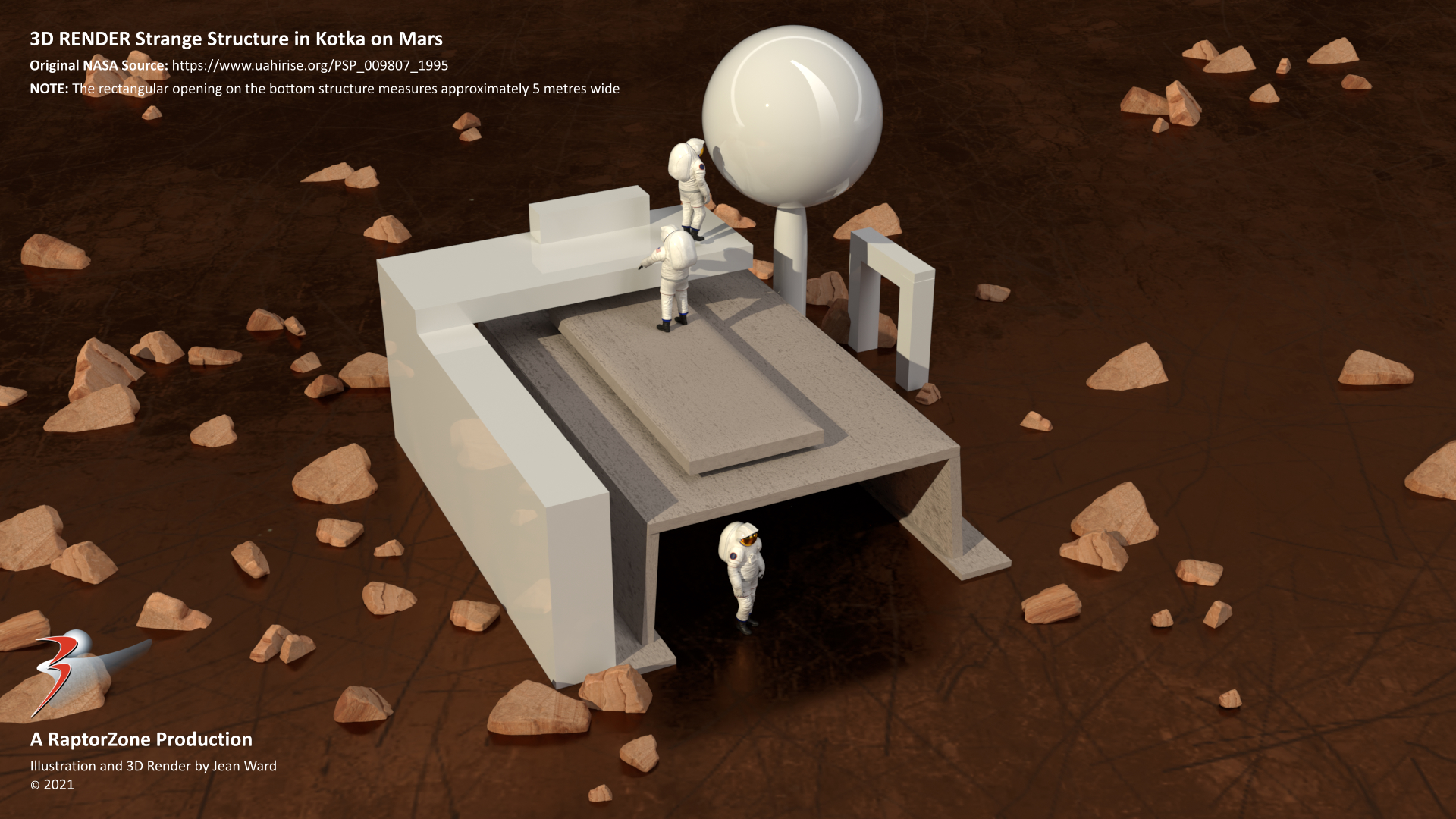 Here I feature a 3D render I created of anomalies I discovered in Kotka located in a region called Cerberus Fossae using Adobe Dimension. The anomaly looks like a structure with three levels to it and an opening on the one side. It also looks like a radar dome-like anomaly an top.