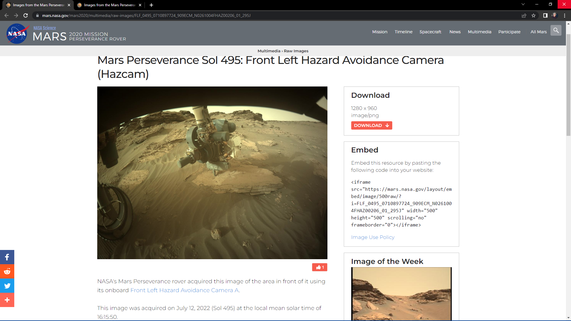 The photographs analyzed here were taken by Perseverance Rover on July 12, 2022 (Sol 495) at the local mean solar time of 16:15:50 and 16:56:25 respectively.