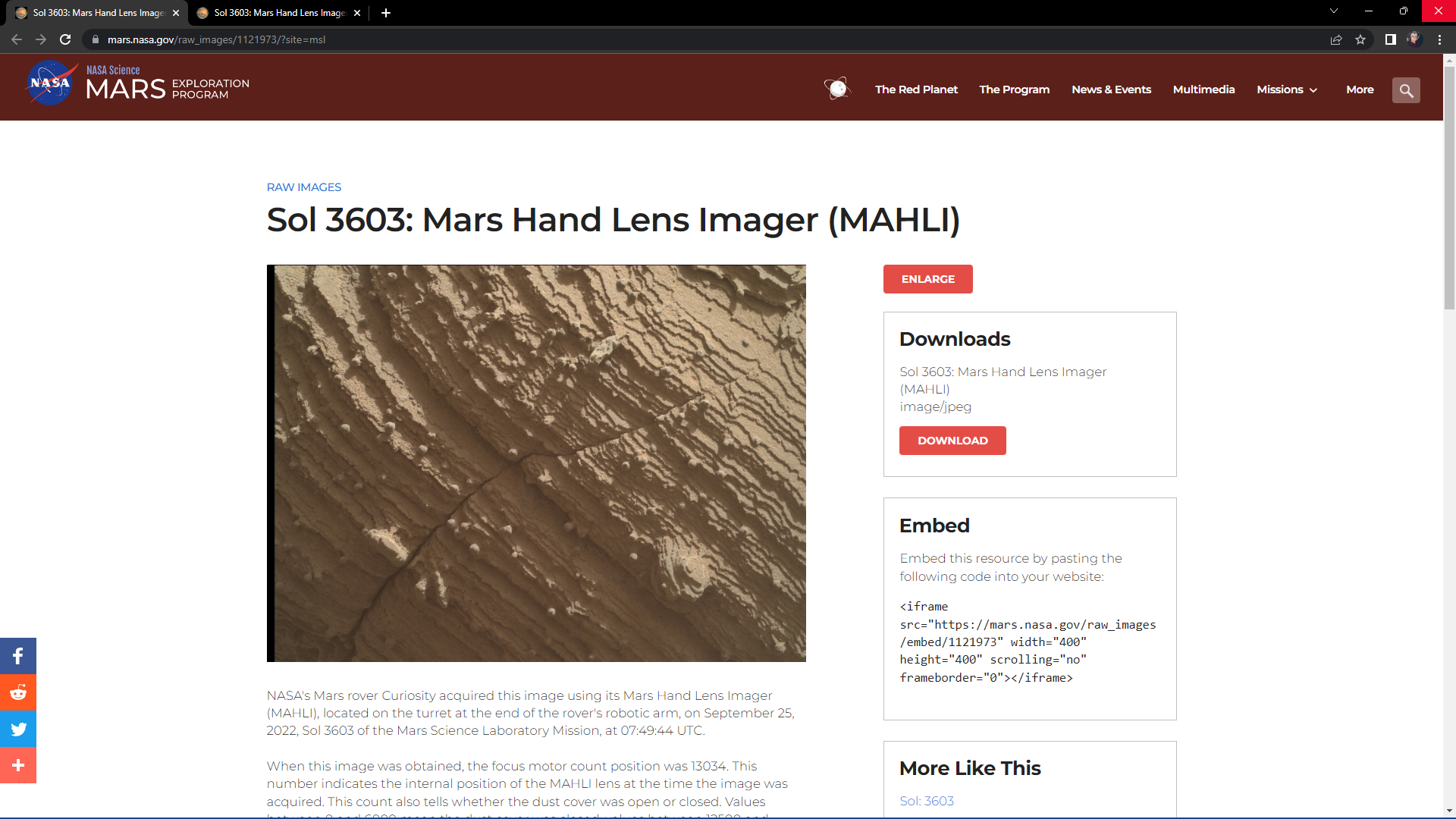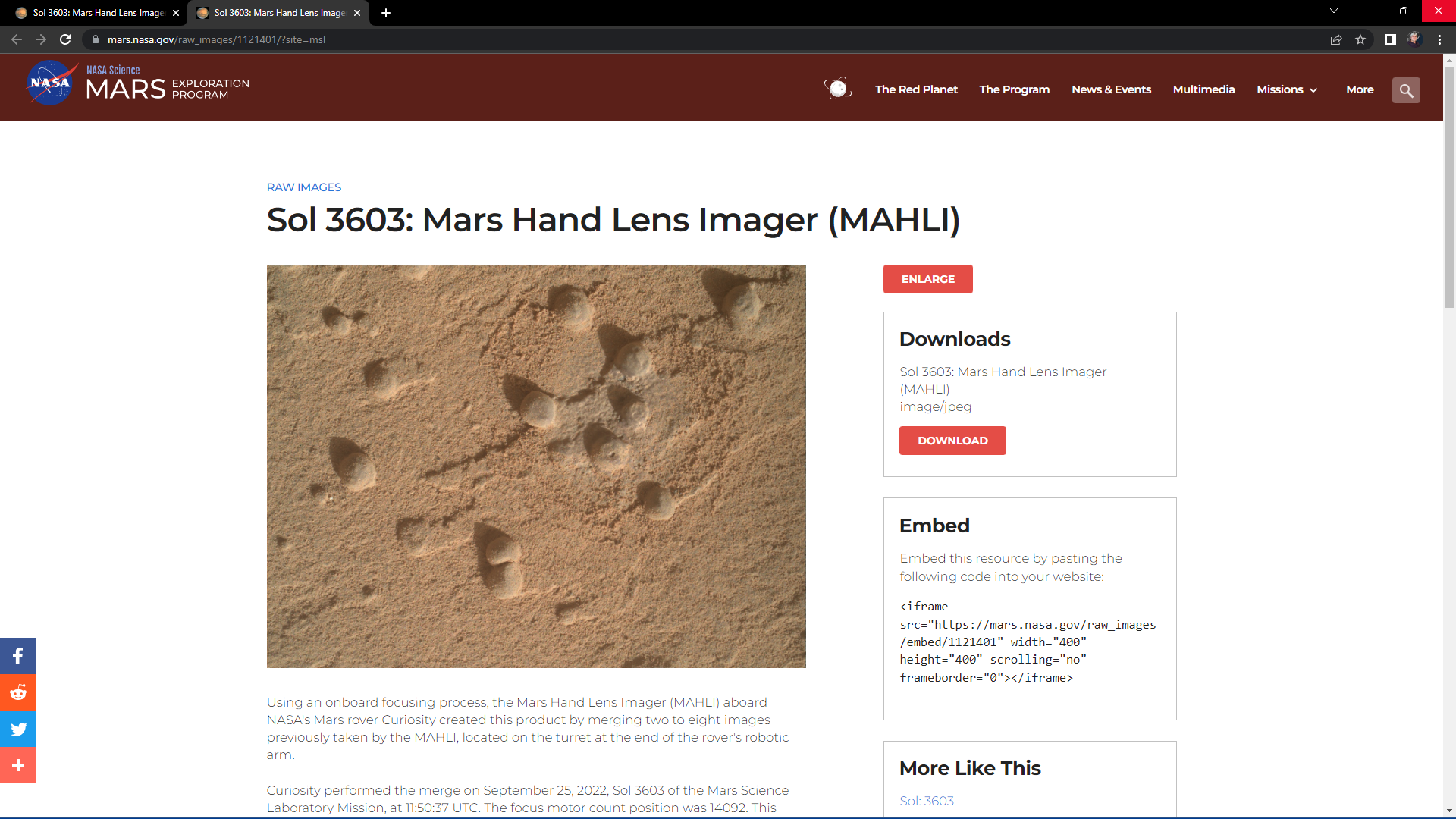 The photographs analyzed here were taken by the Mars Hand Lens Imager (MAHLI), located on the turret at the end of the rover’s robotic arm, on September 25, 2022, Sol 3603 of the Mars Science Laboratory Mission, at 07:49:44 UTC and September 25, 2022, Sol 3603 of the Mars Science Laboratory Mission, at 11:50:37 UTC respectively.