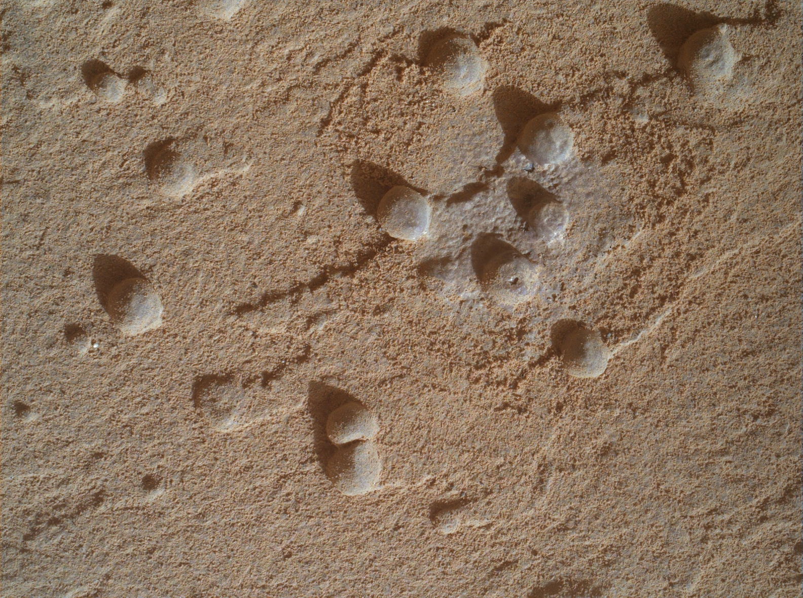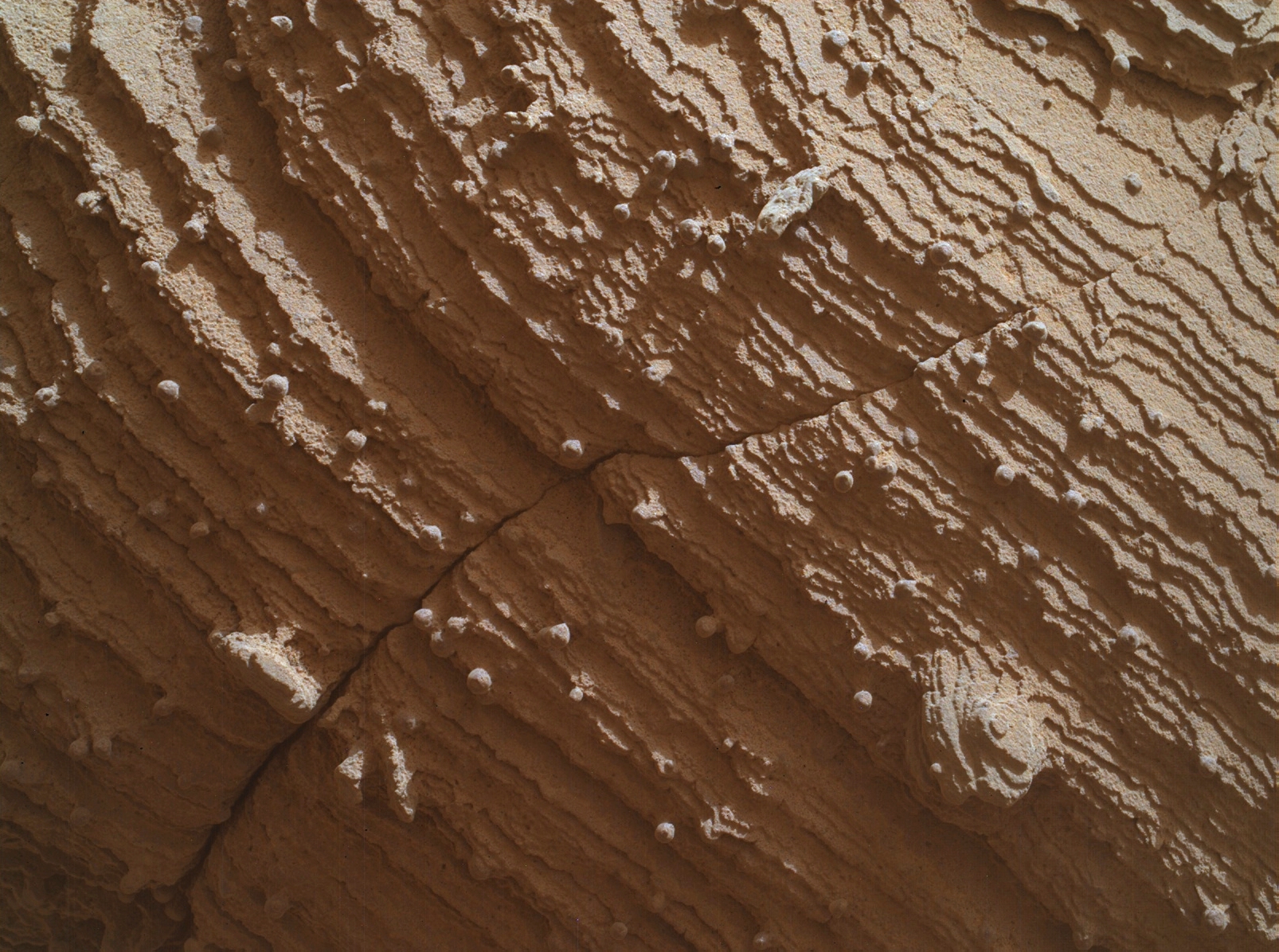 These spherical objects don’t look like the typical pebbles photographed by the rovers in the past in that they are not lying on the surface but seem to be embedded or attached to the side of a bolder. I estimate these spherical objects to be about 1 cm in diameter.