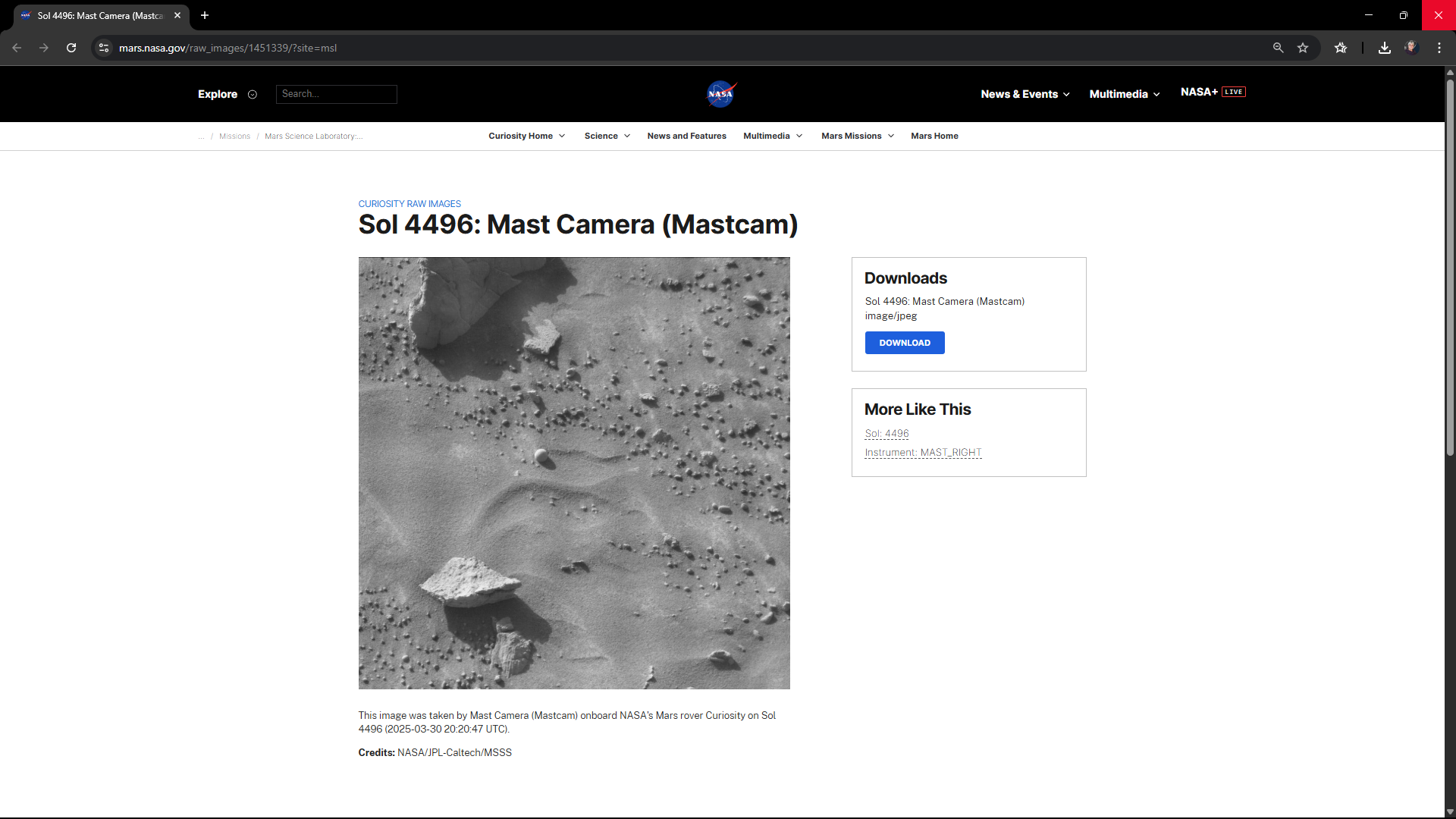 This image was taken by Mast Camera (Mastcam) onboard NASA’s Mars rover Curiosity on Sol 4496 (2025-03-30 20:20:47 UTC).