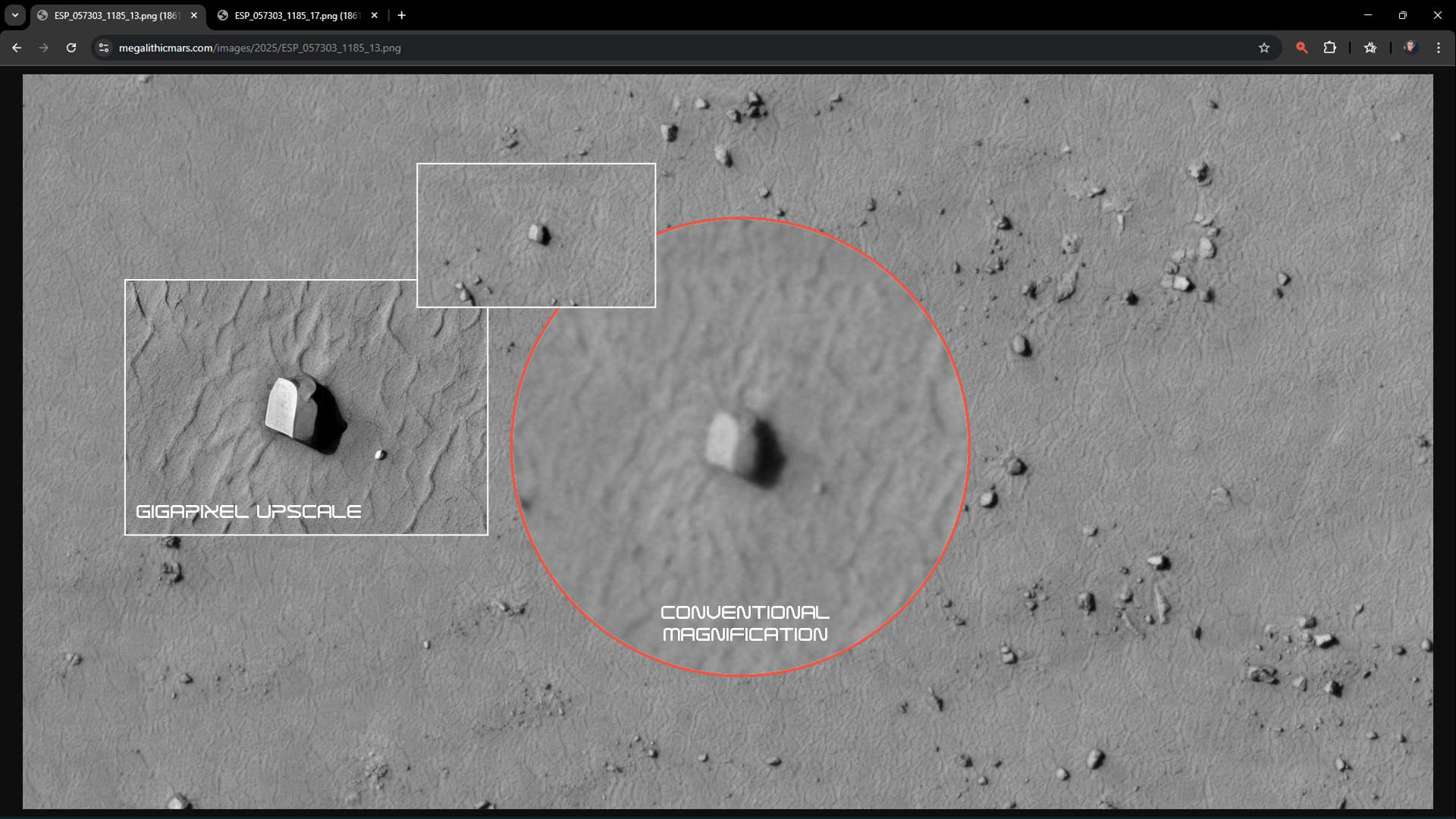 Following are cropped images taken from the original MRO HiRISE JP2 photograph as well as close-up views of the anomalies upscaled using Topaz Labs’ Gigapixel (more about Gigapixel below).